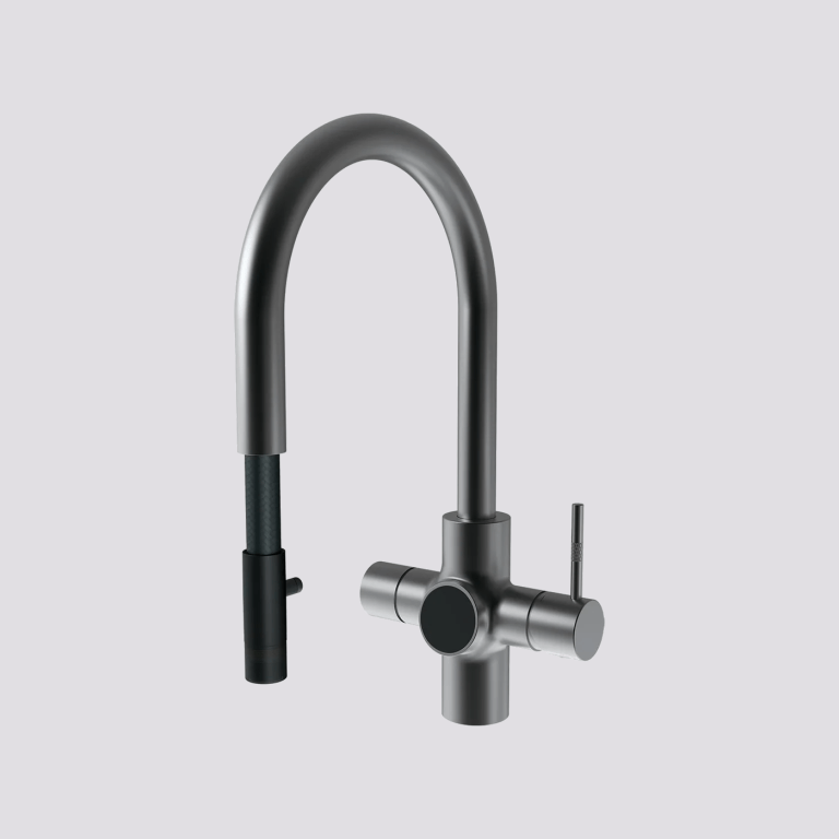 Som en del af Orbit-serien, er 56CP i Gunmetal et helt nyt og moderne look af køkkenvandhaner i T-form. Den er opbygget i høj kvalitet, designet til ergonomisk brug og har intuitiv betjening i form af 180° svingbar tud, digital display og app-betjening.