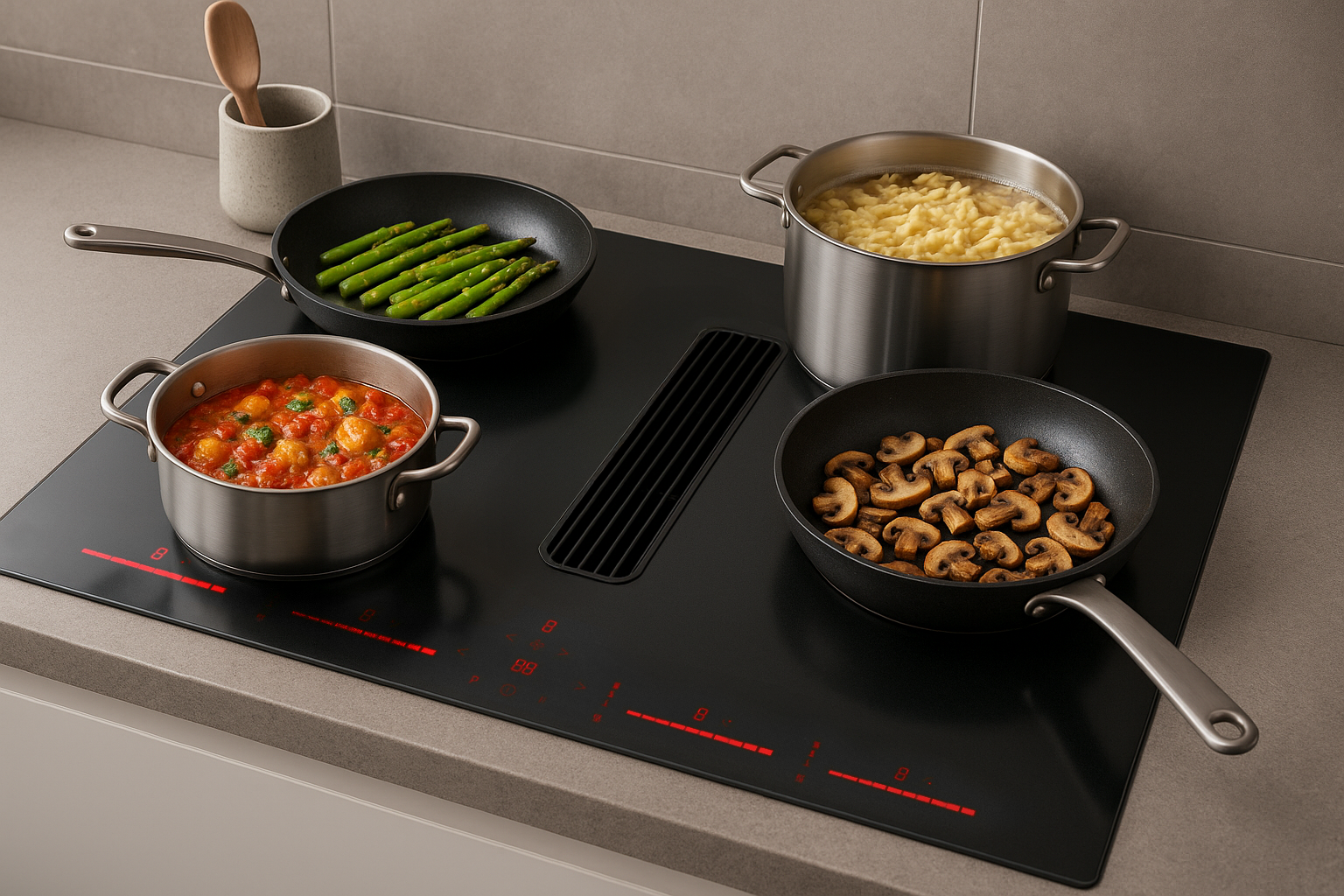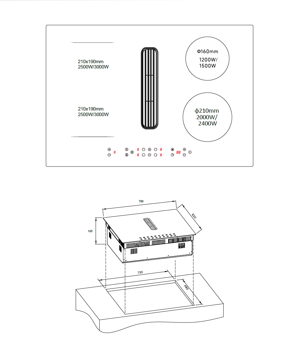 • Effekt: 2x 21x18 cm (2,5/3,0 kW (3,5 kW total)) – Ø21 cm (1,8/2,2 kW) – Ø16 cm (1,2/1,5 kW)